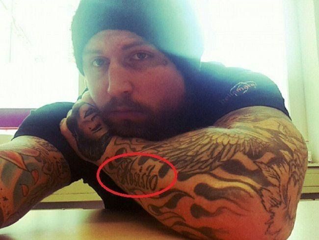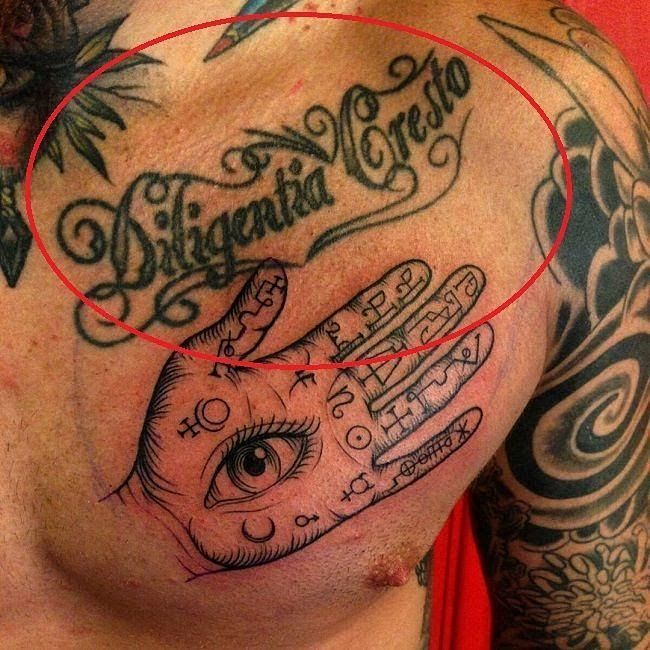 Aleister is a man of mystery and the tattoo depicts the man without a doubt. There are several phrases and words such as Ave Satanas, Contemno, Calavera, Diligentia Cresto, Absisto, Overcome the past and Lamb Wolf are inked all over his body.