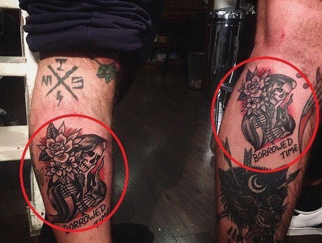 Aleister has two grim reaper tattoos both on his calf muscles. Grim Reaper holding a bunch of flowers with the writing “Borrowed Time: