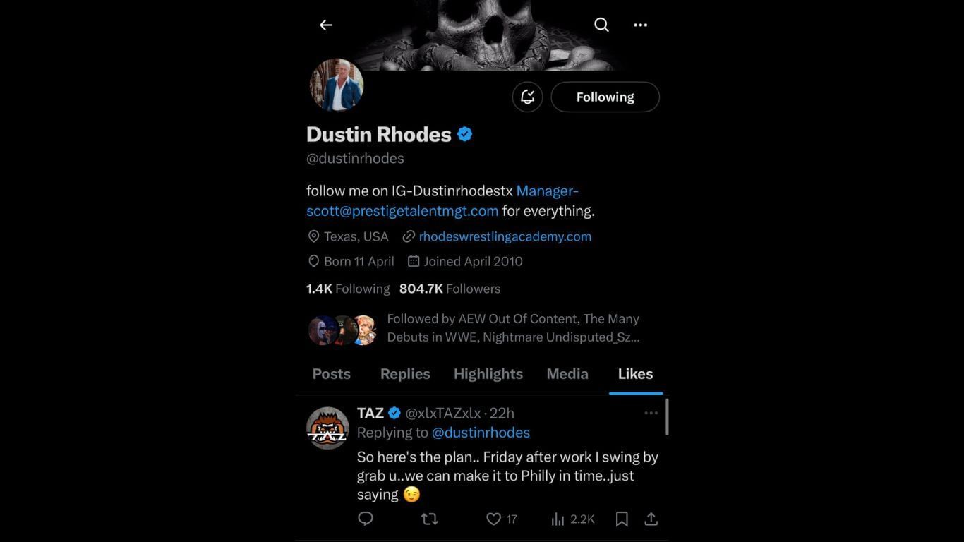 On X/Twitter, Dustin Rhodes liked Taz's tweet in which the latter stated that he would pick Rhodes up after work, and then the duo could head to Philadelphia, Pennsylvania, for WrestleMania XL.