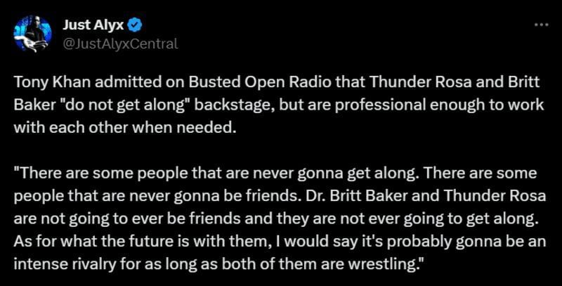 "Dr. Britt Baker and Thunder Rosa are not going to ever be friends and they are not ever going to get along. As for what the future is with them, I would say it's probably gonna be an intense rivalry for as long as both of them are wrestling. These are not two people that are ever gonna be buddies but it's something to follow for sure. Thunder Rosa, we look forward to having her back in the ring," he said. (H/T WrestlingNews.co)