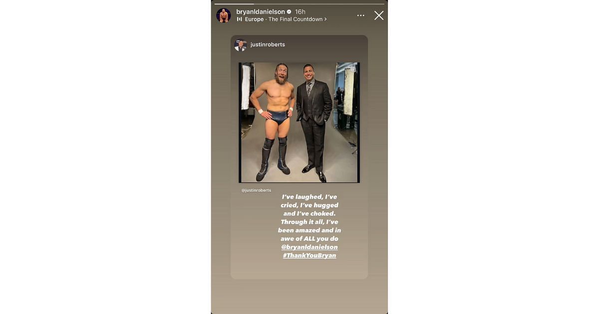 A few hours ago, AEW ring announcer Justin Roberts posted his appreciation for Bryan Danielson on his Instagram account. He shared a picture of himself standing alongside the former WWE Superstar and left a thank you note in the caption.