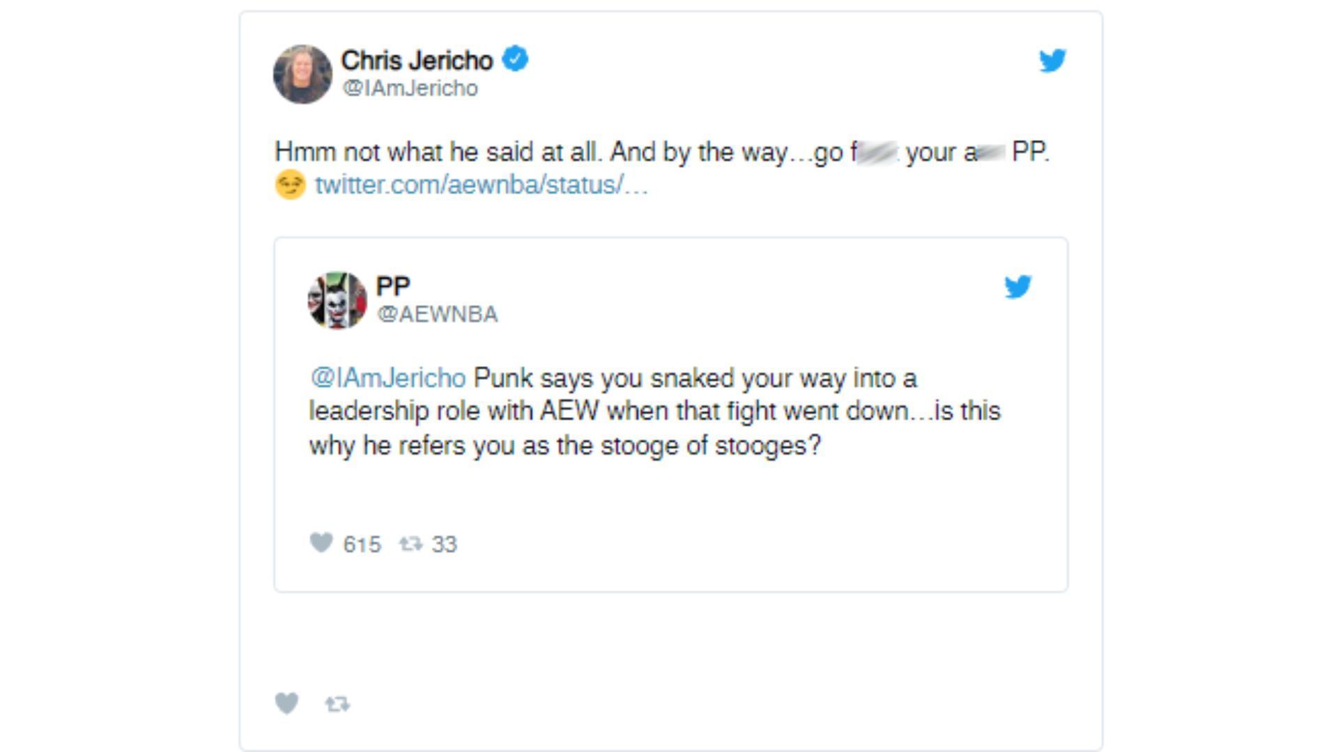 "Hmm not what he said at all. And by the way…go f**k your a** PP," Jericho tweeted.
