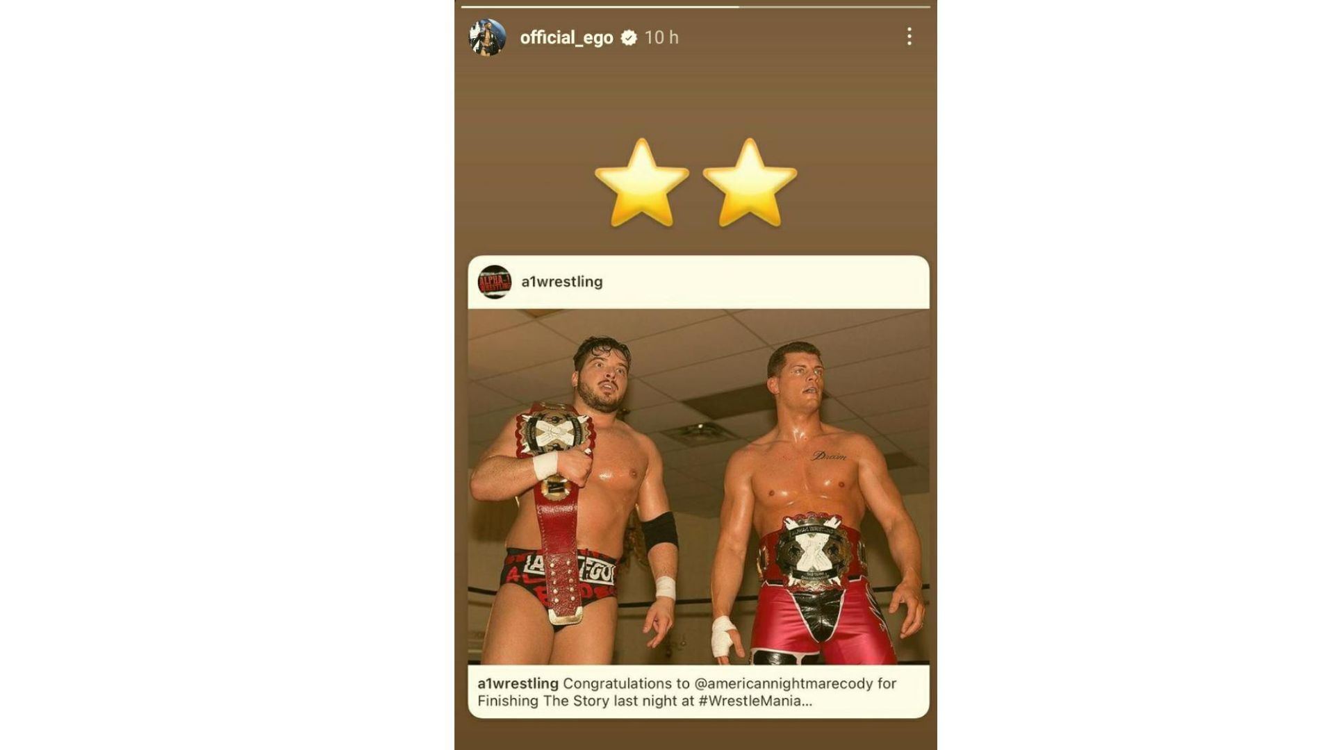 On the heels of the former AEW EVP's massive win at WrestleMania XL, the Instagram page of A1 Wrestling shared a photograph of Rhodes and Page, congratulating the WWE Superstar and thanking him for his contribution to the company's growth. Ethan Page shared the picture in his story with two stars in the caption, referencing their partnership.