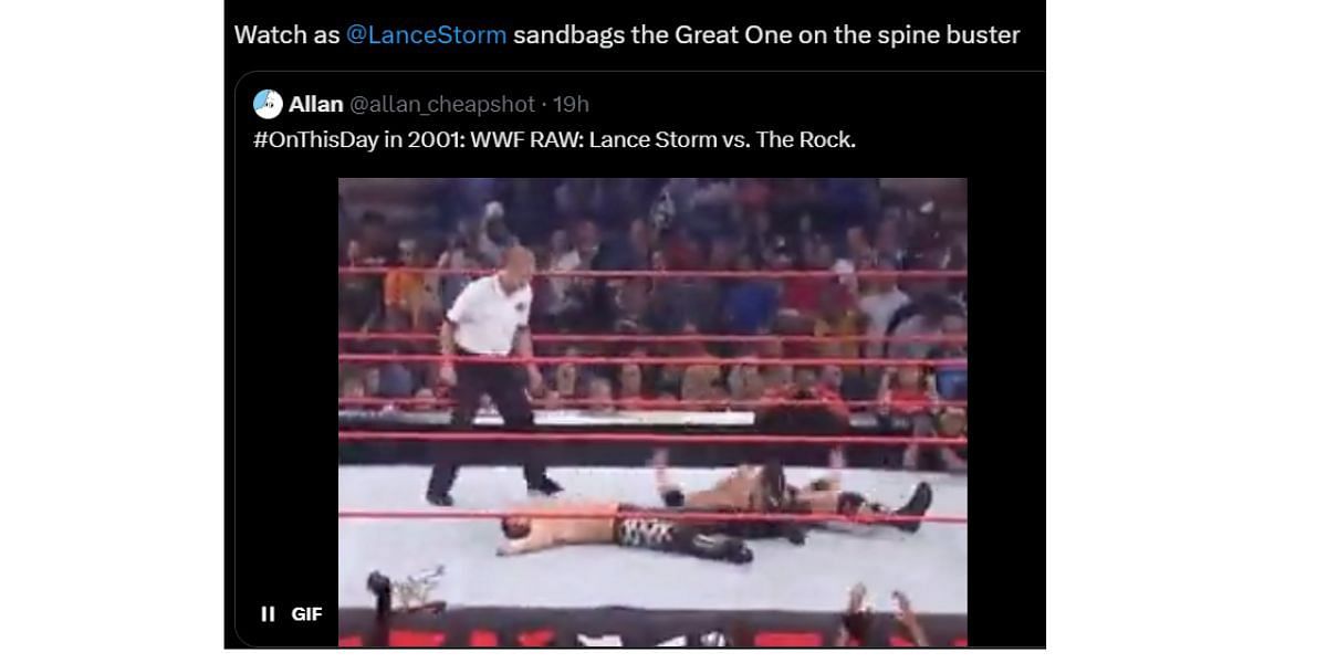 The clip shows an interesting facet of the Rock too, who sells the pummels that he gets at the hands of Lance Storm in a way that only he could.