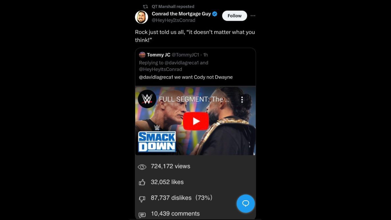 On Twitter, a fan posted the screenshot of the segment between Roman Reigns and The Rock, which was posted on YouTube by WWE. The video currently has much more dislikes than likes, which shows us how a portion of fans are upset with the shocking change of plans. The fan's tweet was reposted by QT Marshall.