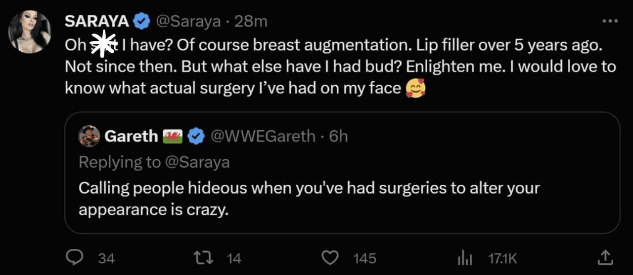 “Oh sh*t I have? Of course breast augmentation. Lip filler over 5 years ago. Not since then. But what else have I had bud? Enlighten me. I would love to know what actual surgery I’ve had on my face.”