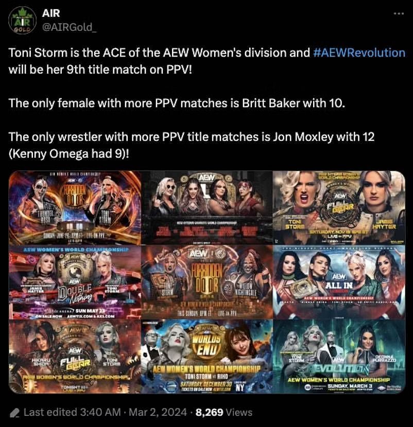 Storm has defended the title against all challengers and has held on to the belt for 106 days. She is set to defend her title at AEW Revolution against her toughest opponent yet; Deonna Purrazzo. This will be her ninth title defense on Pay-Per-View, second only to Britt Baker, who defended her title 10 times on PPV.