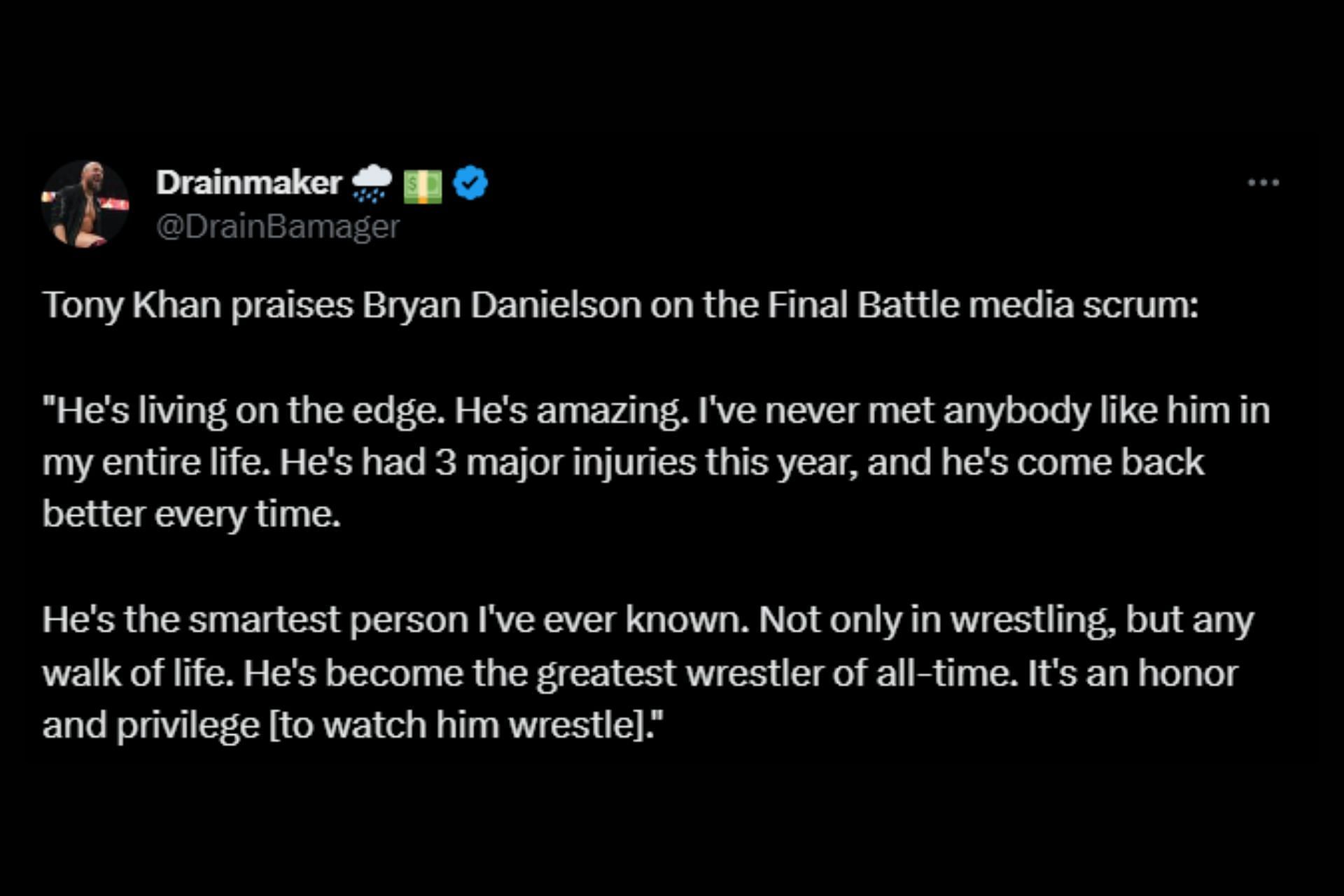 That wrestler is none other than 42-year-old Bryan Danielson, who recently returned to the ring after his orbital bone surgery and is once again performing in some of the most intense matches in All Elite Wrestling. Khan had only good things to say about Danielson: