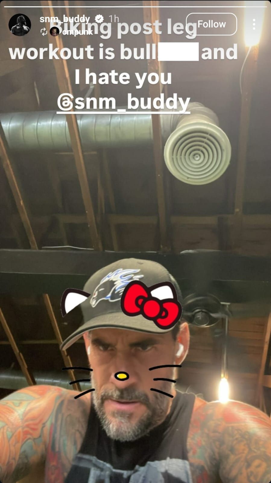 Recently, the former AEW World Champion worked out with Buddy Matthews. Apparently, the duo did leg workouts together and then rode bikes following the intense exercise session. CM Punk did not like this idea and took to Instagram to share a story. He then stated that he hated the Australian star for making him do it. Buddy Matthews also reshared the story on his Instagram.