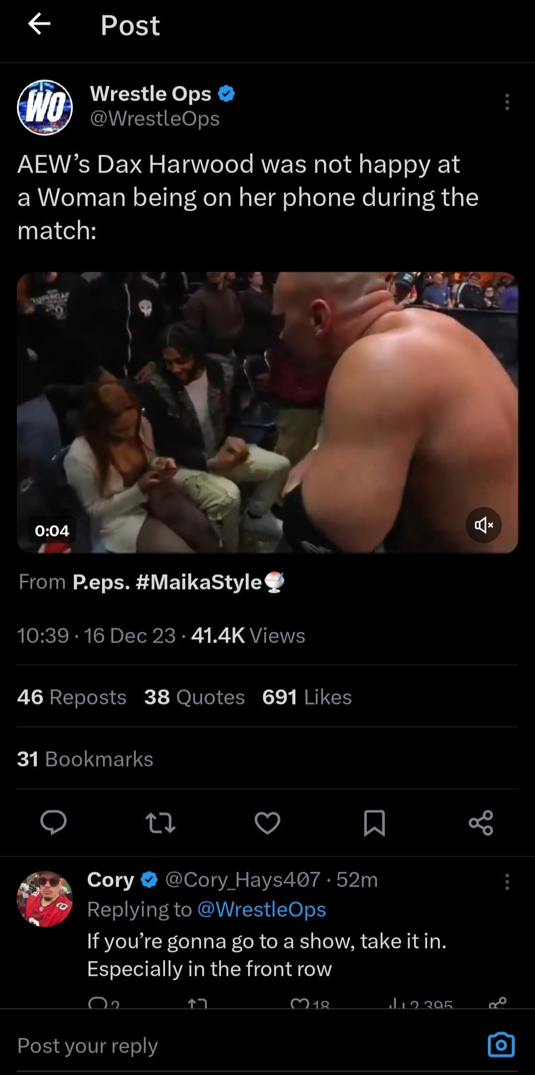 "AEW’s Dax Harwood was not happy at a Woman being on her phone during the match," a Twitter user shared.