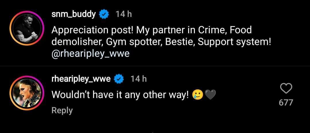 "Appreciation post! My partner in Crime, Food demolisher, Gym spotter, Bestie, Support system! @rhearipley_wwe" - Buddy Matthews posted.