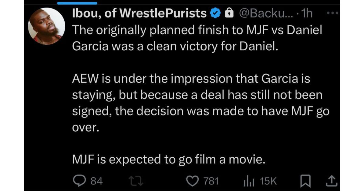 In an unpredictable, back-and-forth encounter, MJF managed to steal the victory with a sneaky pinfall. However, the match's finish was supposed to be different, per a report. Ibou of WrestlePurists has reported that Garcia was expected to get a clean win over The Wolf of Wrestling but the contest's climax was changed due to contract reasons.
