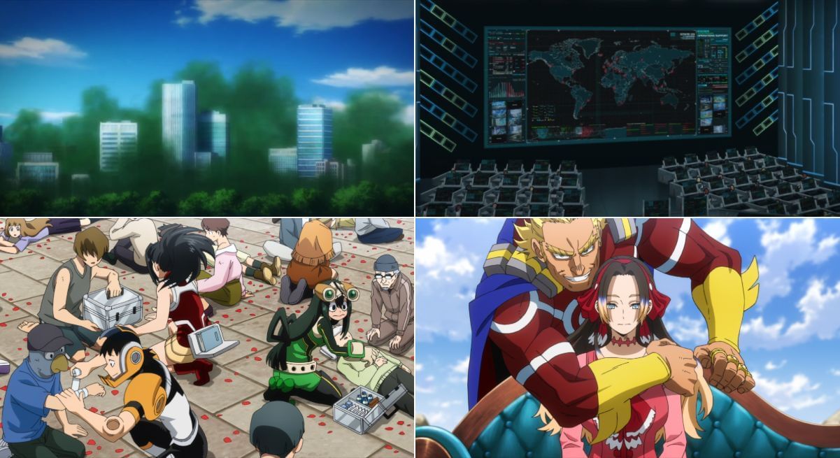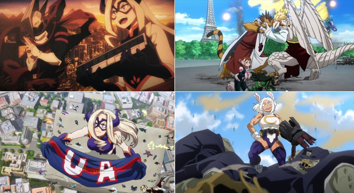 World Heroes' Mission and You're Next showcase the heroes taking a more active role. In the former, they collectively confront Humarise globally through raids on their compounds and battles to prevent Trigger bombs from detonating. In the latter, Japan's remaining pro heroes strive to prevent Gollini's fortress from engulfing U.A. and later team up with Class 1-A to save all the kidnapped civilians while also saving Class 1-A from being overwhelmed.