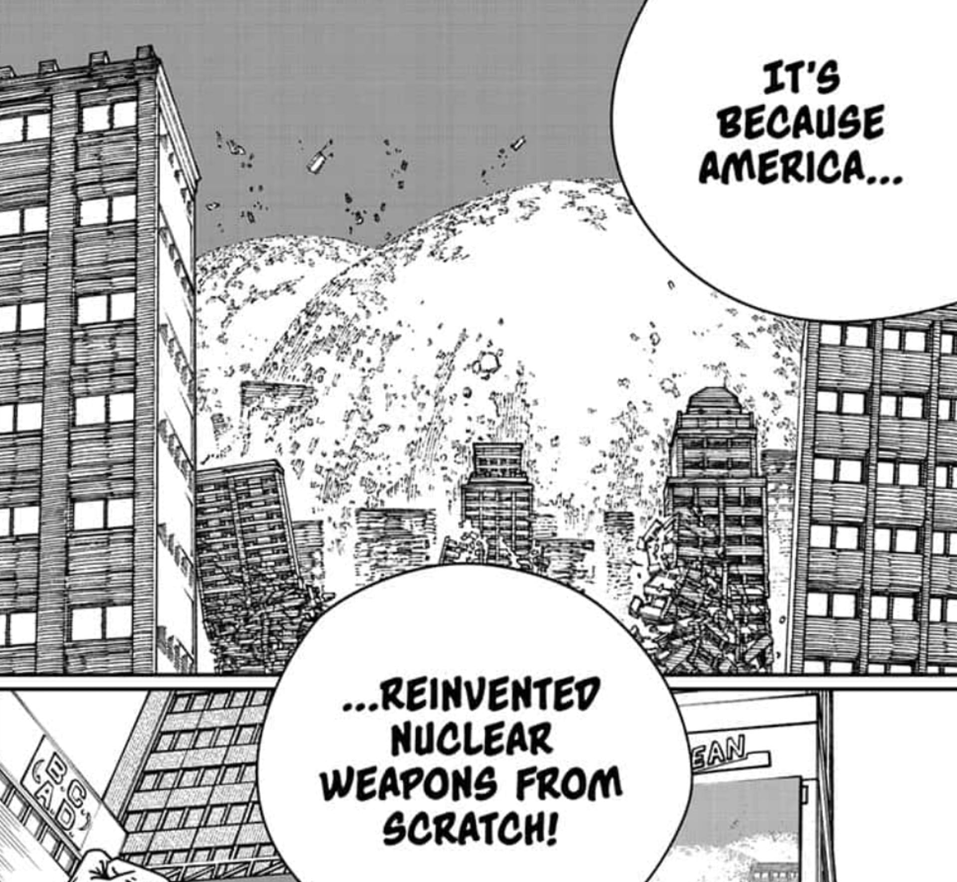 But this is where the mentioned flaw in Pochita's ability is visible. As it stands, erasing or wiping out a concept by consuming its Devil doesn't necessarily do away with the components of that concept. To elaborate, while nuclear weapons as a concept was deleted, the elements used to create these weapons remained. Thus, as Yoru states, "...America reinvented nuclear weapons from scratch".