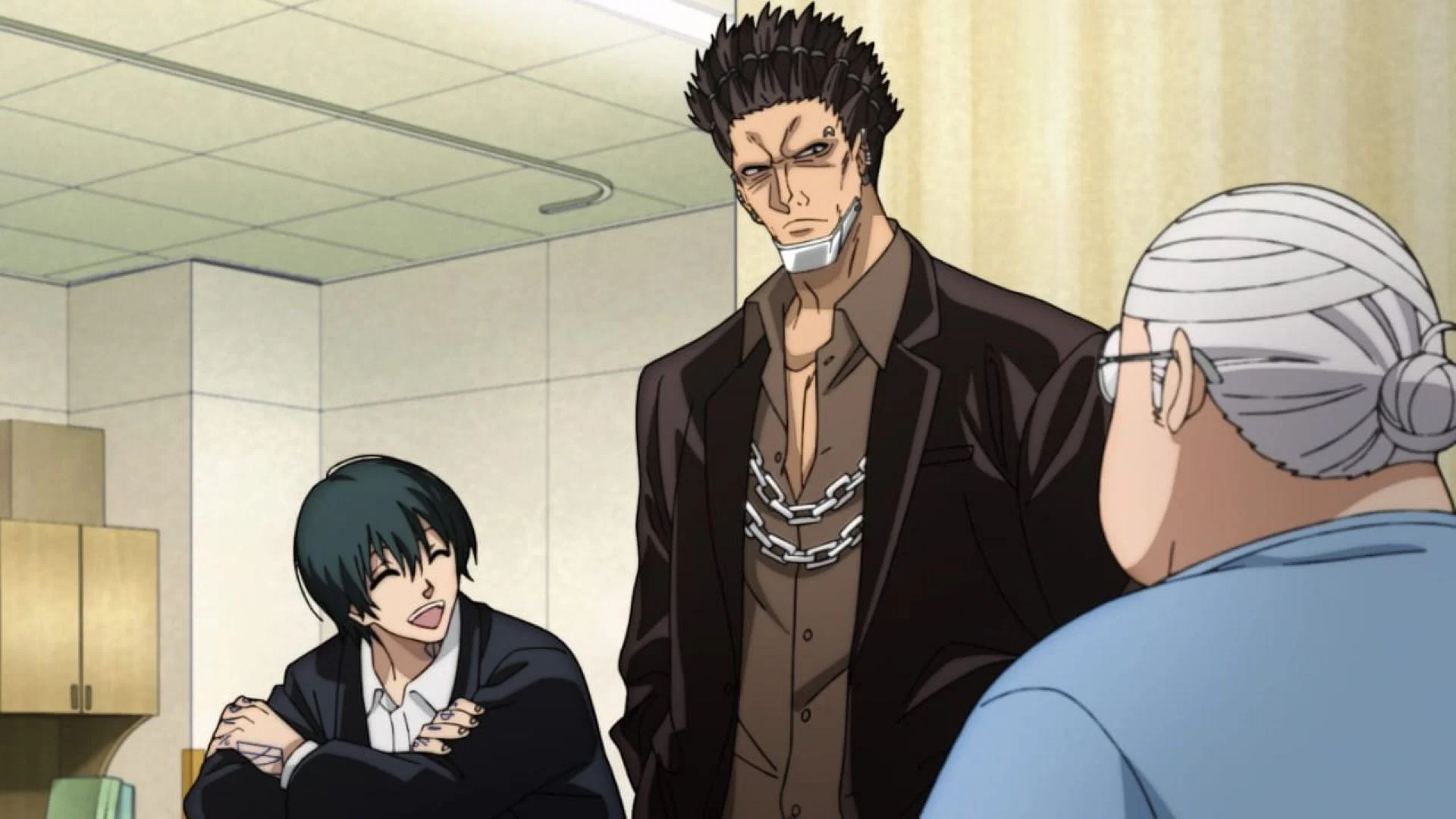 Just then, someone from the higher ranks arrives at the scene and asks Inoda about the casualties. Inoda replies that around 40 people have died on the first three floors. Moreover, it has only been two minutes since the intruders launched the assault. Just then, Gaku arrives at the scene and delivers a fatal blow to the assassin to send him down to a van.