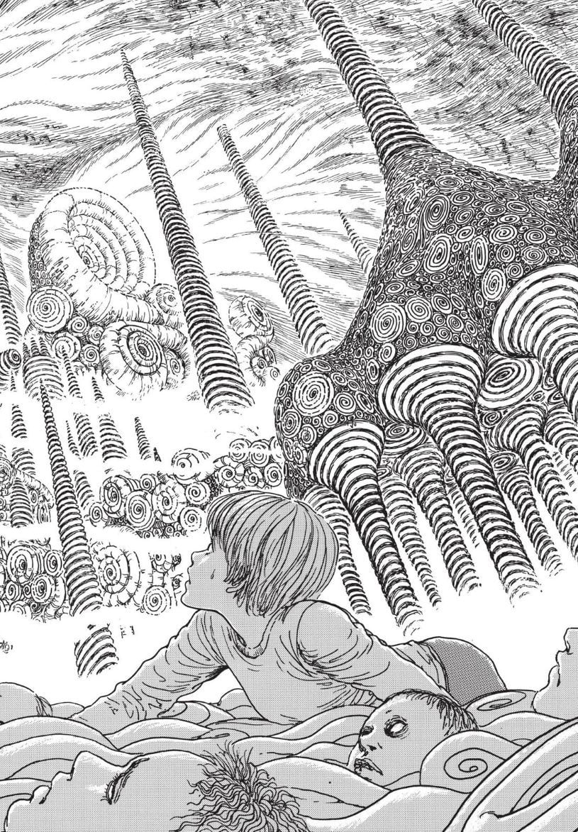 As she tumbles down the stairs, she finds herself in the City of Spirals, the capital of the sentient, evil Spiral that has been destroying their town. She falls softly into the city, composed solely of the bodies of Kurouzu-Cho's spiral-cursed citizens, all facing the enormous spiral that towers over them.