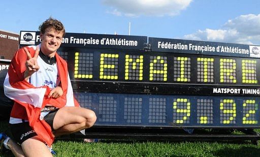 Christophe Lemaitre, seen here posing near a board after clocking 9.92sec for his 100m race in the France’s Athletics championships, in July 2011, in Albi, southern France. Lemaitre became the first white sprinter to break the symbolic 10sec barrier in 2010 and his personal best is is 9.92sec.