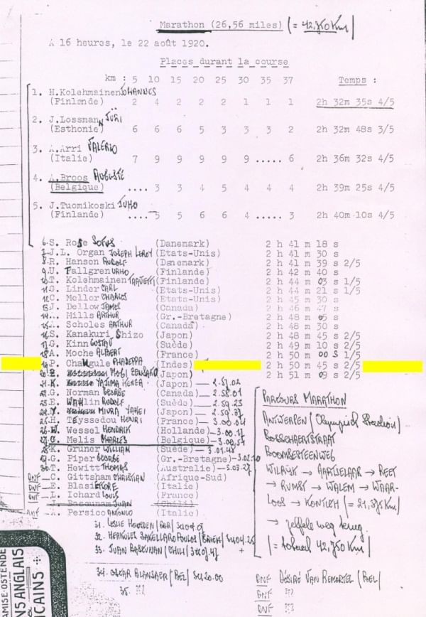 When India sent its first contingent for the 1920 Antwerp Summer Olympics, there were six athletes. PD Chaugule became the first Indian athlete to participate in the Olympics in the 10,000 metres. He finished 19th in the marathon, clocking a time of 2 hours 50 minutes 45.2 seconds .