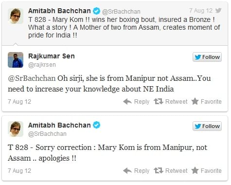 Siddarth: Sad but true. But those stars who tweet their support may be doing good. I have to just hop in your side of the fence for a second. Amitabh Bachhan tweeted that Mary Kom did Assam proud. Ouch. She’s from Manipur. Ok, switching back to my side. Leap. Senior Bachhan has had the dubious honour of getting to carry the Olympic torch. I call it dubious since the torch can be a thing of pride if you are an athlete and a lightening rod of controversy if you are a celebrity. People talk about more deserving candidates who have made a name through their athletic accomplishments. And Amitabh risked that backlash when he chose to carry the torch.