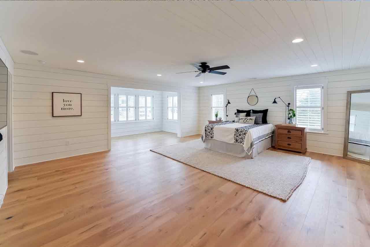 Upgraded black and white tiles can be found in the master suite bedroom, the Jack and Jill bath and the suite bedroom. The custom wide plank oak hardwood floors, 1×8 shiplap walls and brick fireplace with expanded hearth make for an opulent feeling.