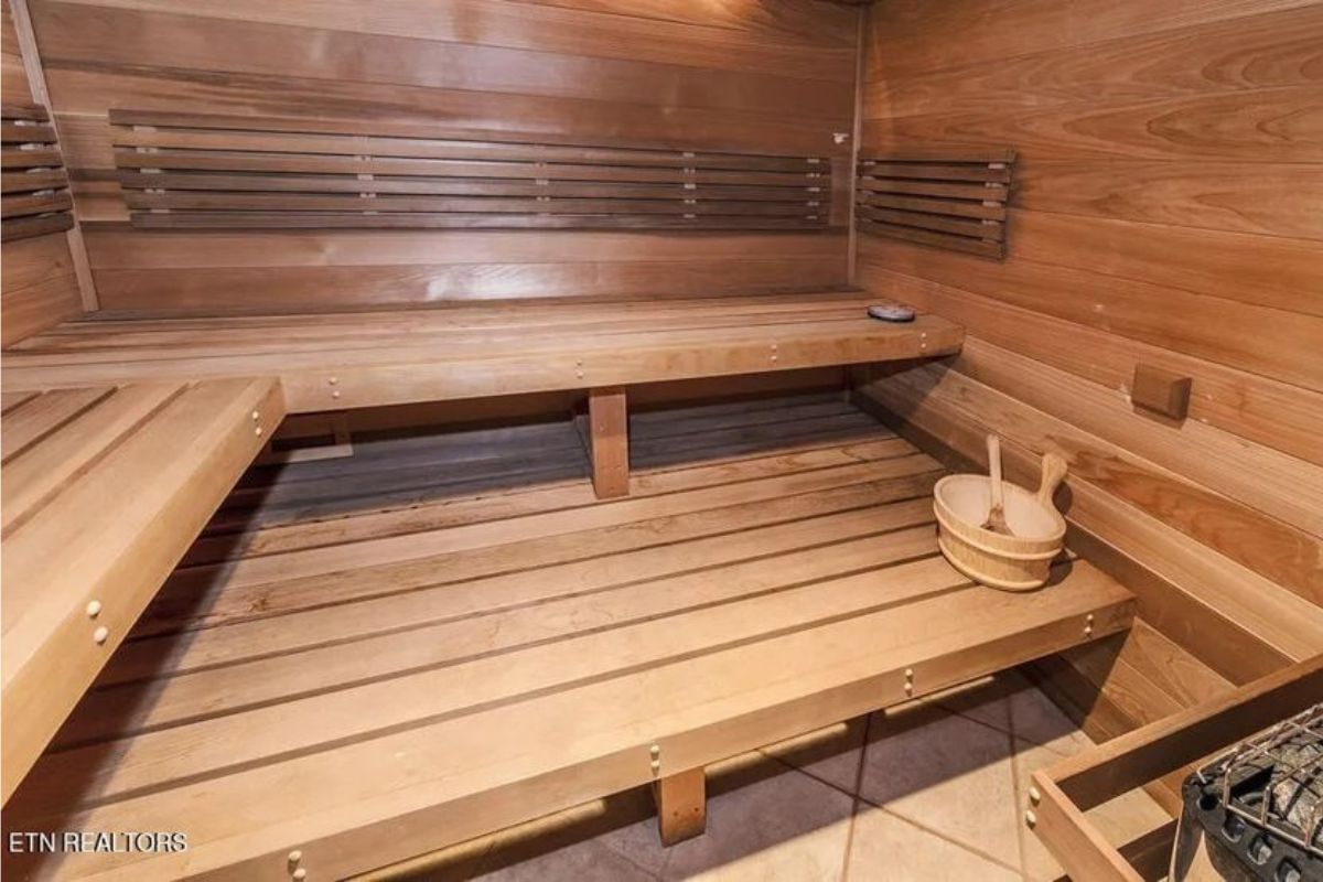 The house also has a sauna for those who want to relax after a long hard day of work. There's also an outdoor pool and a guesthouse that has its own kitchen and living room.