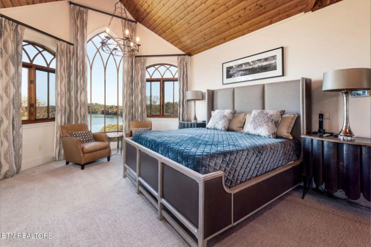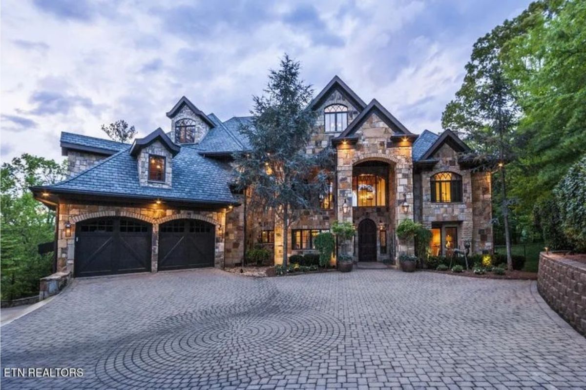 Helton's Knoxville mansion has cathedral ceilings and beautiful beams that grace the entrance and living room. The house also features a curved staircase, with a gigantic fireplace, along with a double bank of extra-large windows.