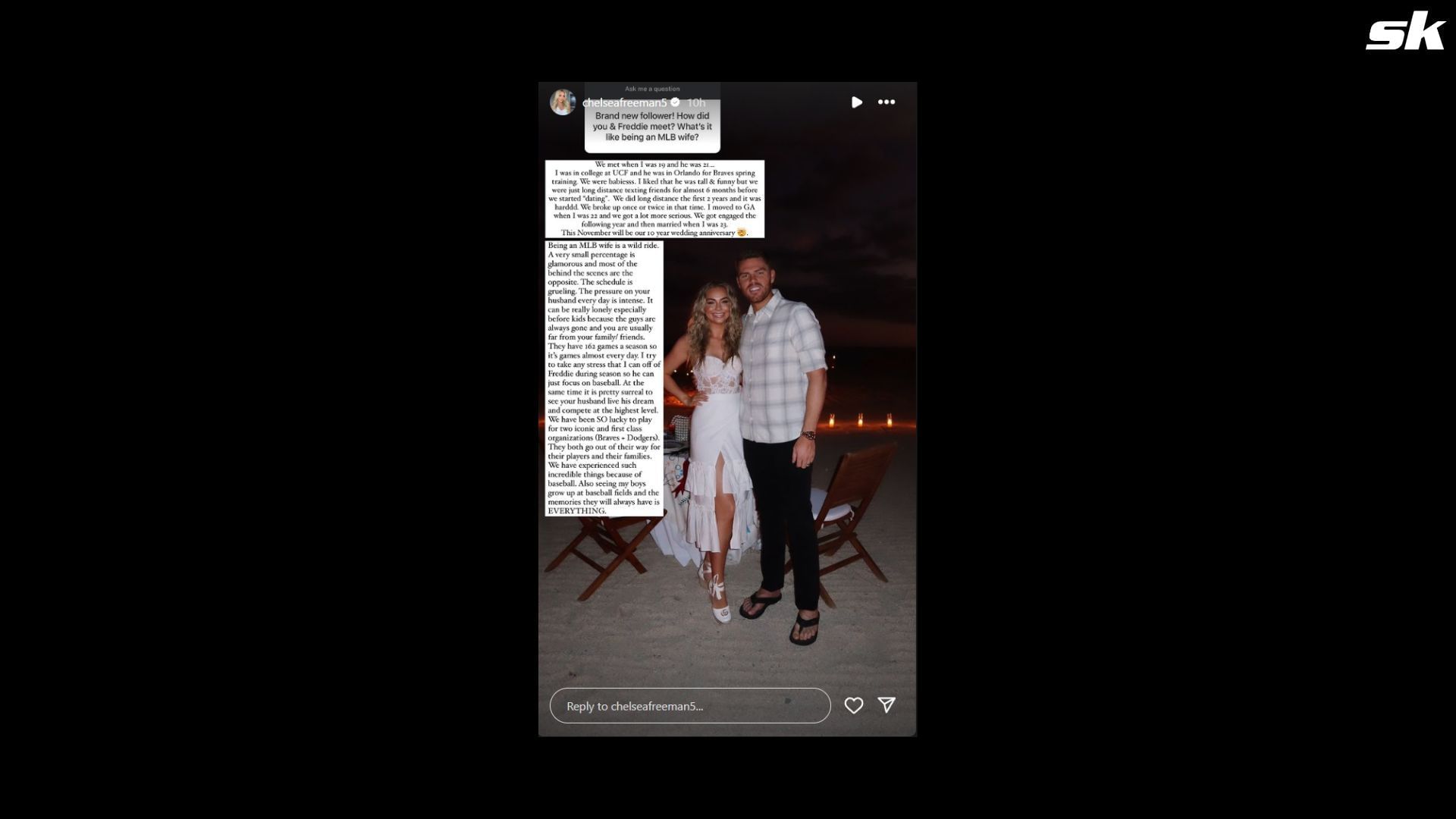 On Tuesday night, she shared an interesting excerpt from her life on Instagram story when one fan asked her what it's like to be a baseball wife and how she and Freddie Freeman met each other. Chelsea replied by writing: