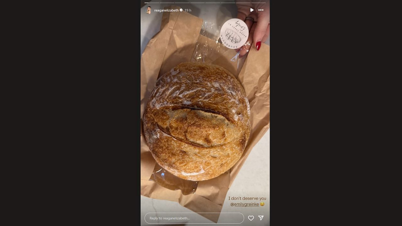 On Saturday, Reagan uploaded a heartfelt story about a special gift she received from one of her friends. The image featured a beautifully patterned sourdough bread in a brown paper bag.