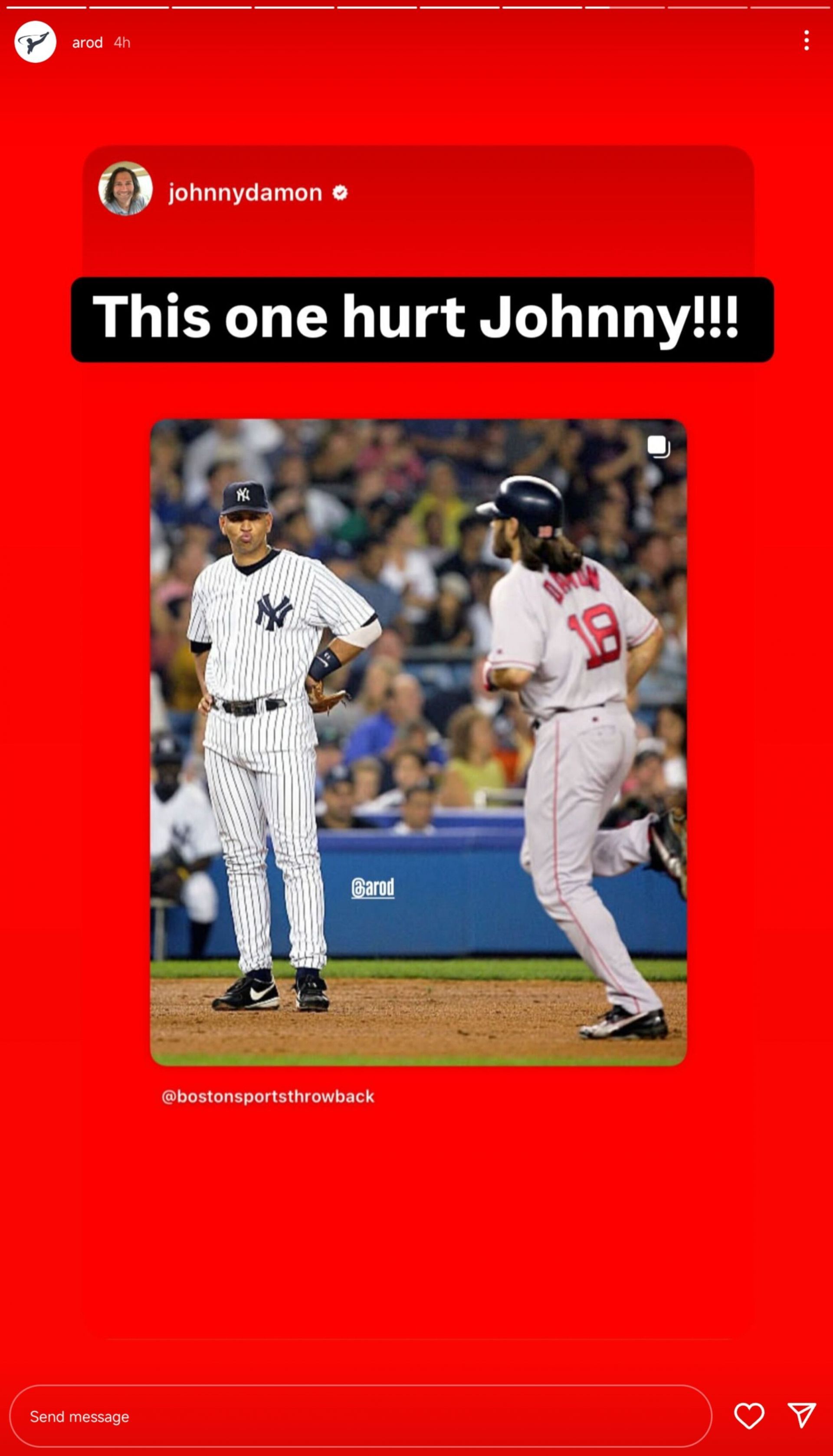 The Red Sox came back from behind in the ninth inning against Mariano Rivera to take the game 3-2 and stun the crowd at Yankee Stadium. Damon shared a picture from the game in his story, featuring himself and a pensive Rodriguez.