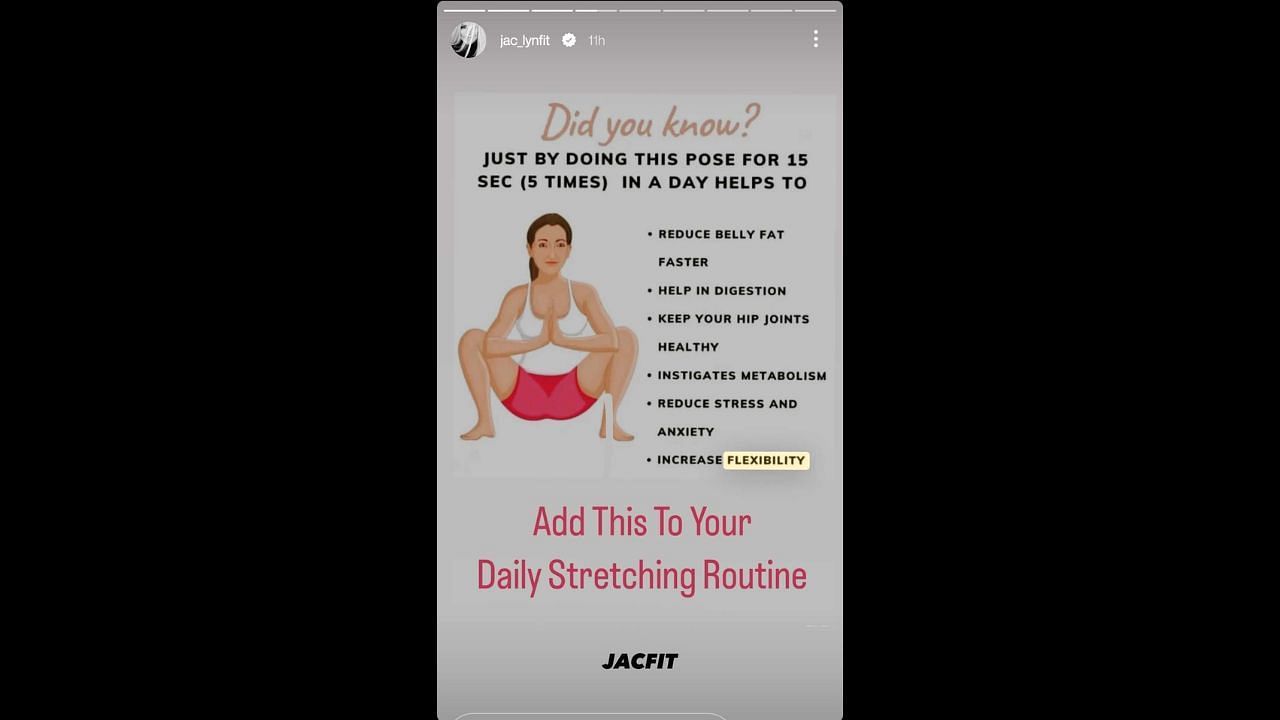 She took to Instagram story on Friday to share an image, mentioning the various benefits that can be achieved by doing the aforementioned stretch for as little as 15 seconds, five times a day.