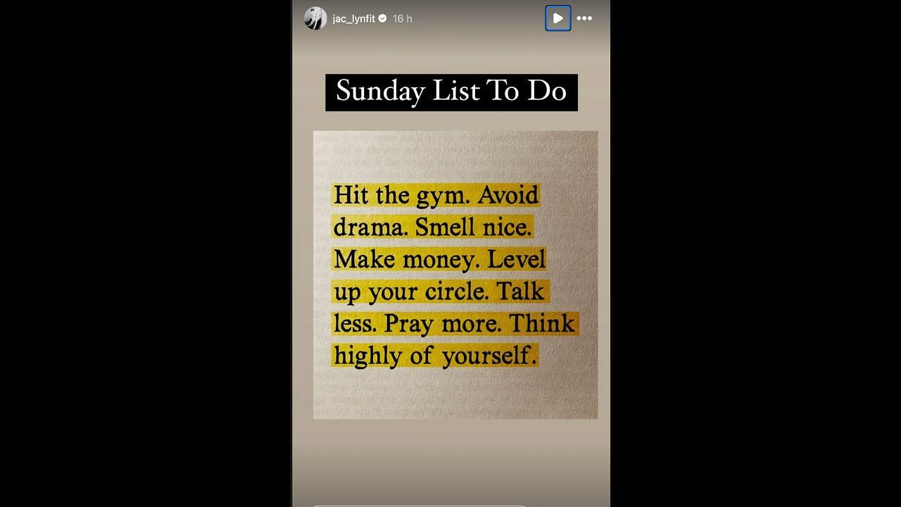 "Hit the gym. Avoid drama. Smell nice. Make money. Level up your circle. Talk less. Pray more. Think highly of yourself." the image that Cordeiro shared via her story read.