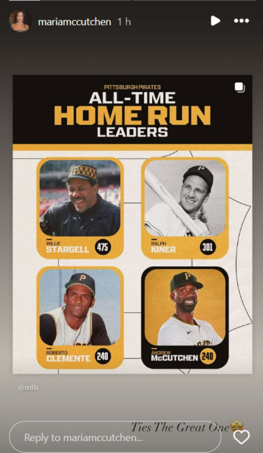 "Ties the great one," Maria wrote in her story with a graphic from MLB sharing the Pirates veteran's elite company.