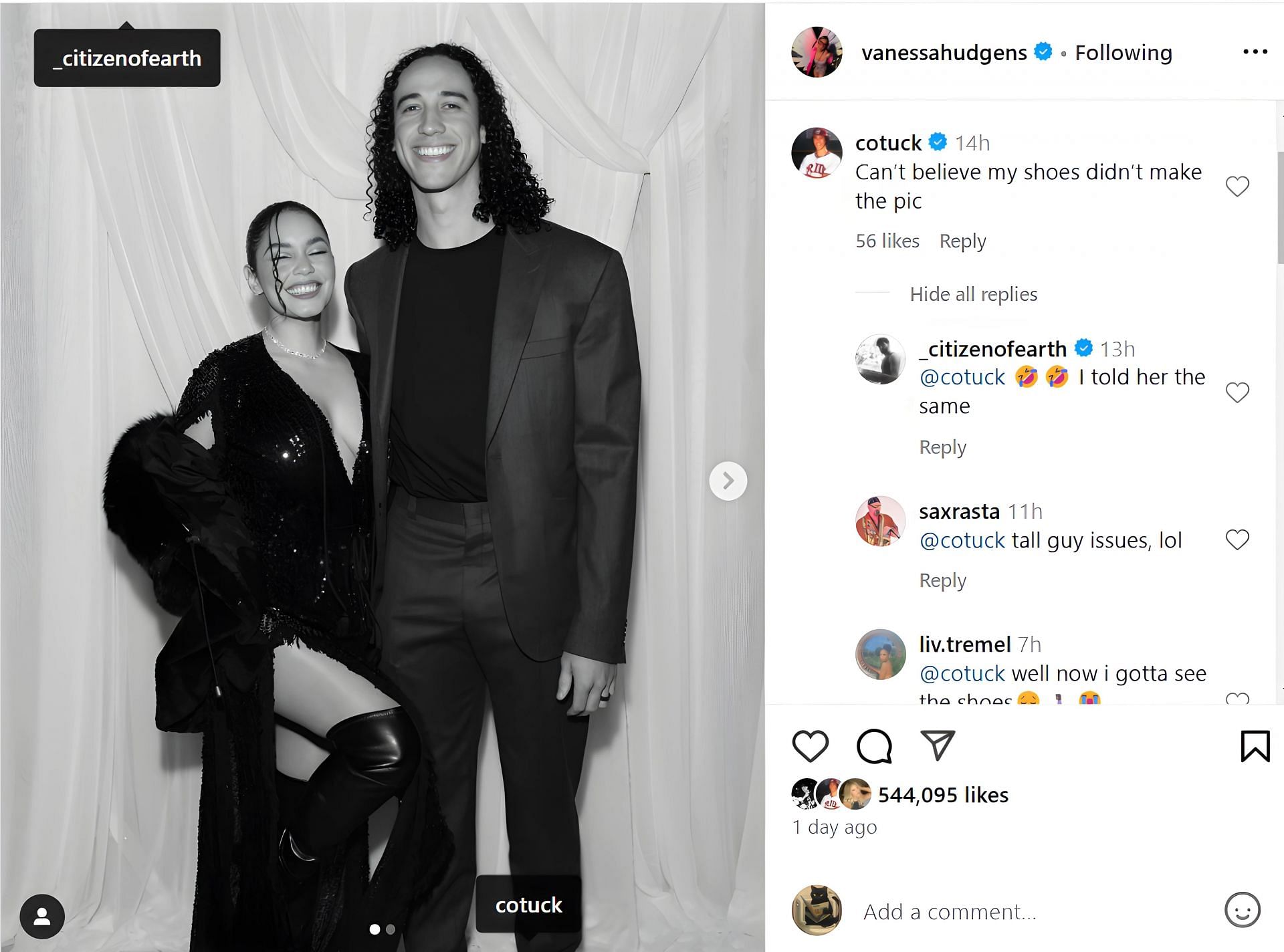 The latest update about the two came on Friday on Instagram when Hudgens shared several photos of them at a New Year's party. In the pictures, Hudgens wore an elegant shimmery black dress with matching accessories, while Cole Tucker sported a stylish suit.