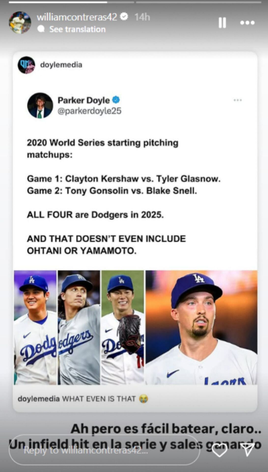Contreras shared a post in his Instagram story highlighting the fact that Tyler Glasnow and Blake Snell were up against Clayton Kershaw and Tony Gonsolin when the Tampa Bay Rays faced the Dodgers in the World Series in 2020.