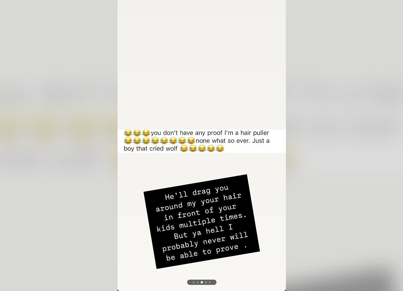 "He'll drag you around by your hair in front of kids multiple times. But yeah hell, I probably never will be able to prove," she wrote.