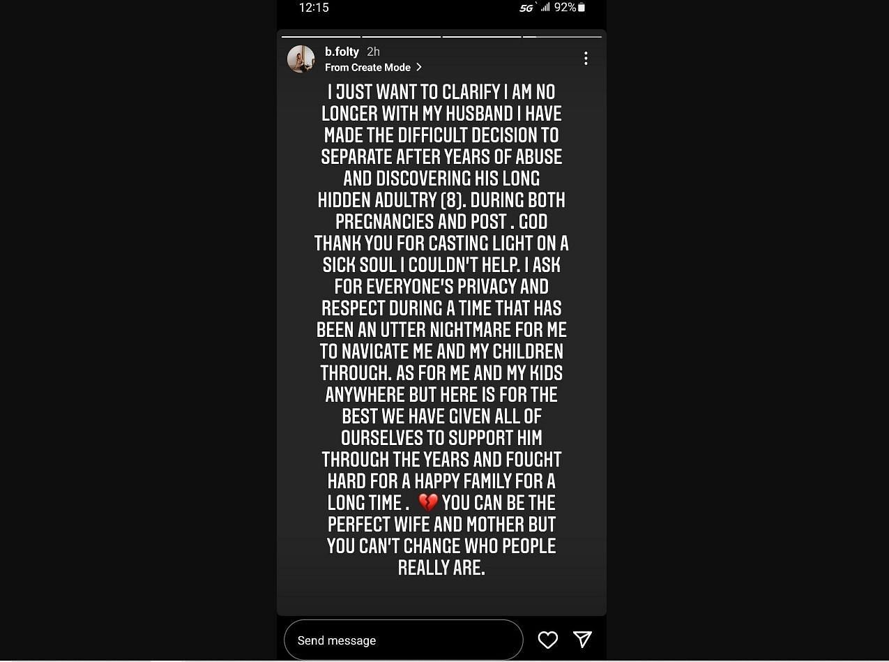 In it, she wrote that she was "no longer with her husband" and "made the difficult decision to separate after years of abuse and discovering his long hidden adultery."