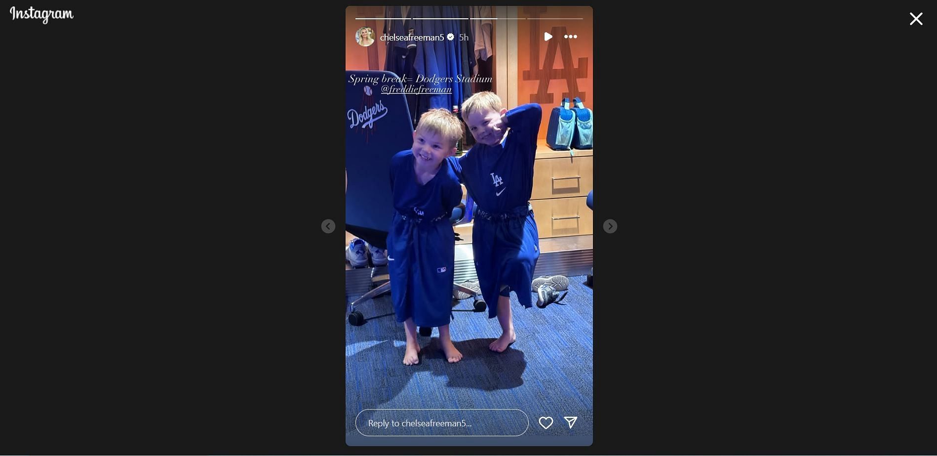 Chelsea took to social media to share an adorable photo of Freddie Freeman’s sons rocking matching Dodgers robes with infectious smiles.