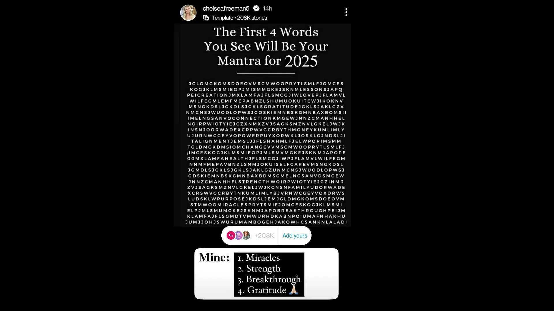 Freddie Freeman's wife Chelsea participated in the ongoing IG story trend, where users list the first four words they see in a word search. These words become their mantra for the upcoming year. Chelsea shared the four words she found first in the puzzle.