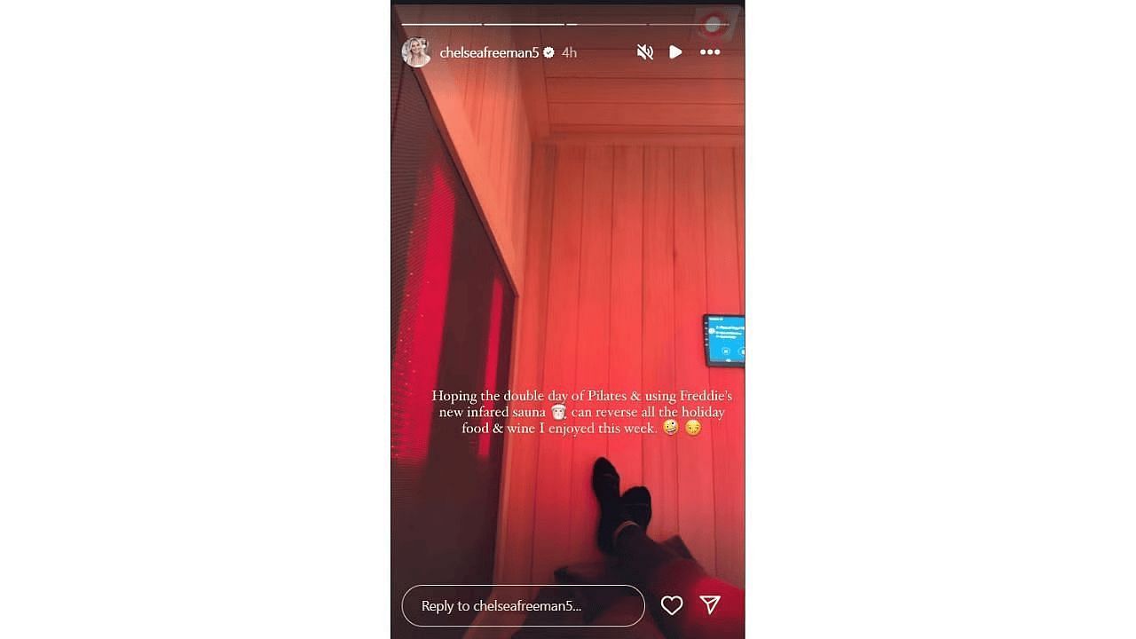 "Hoping the double day of Pilates & using Freddie’s new infrared sauna 🧖♀️ can reverse all the holiday food & wine I enjoyed this week," she wrote in the caption.