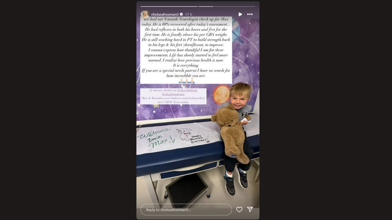 That was a difficult time for both Freddie and Chelsea, and the Dodgers' first baseman even had to miss part of the season to care for their son. With Max’s health showing positive signs, Chelsea shared an update on Instagram on Thursday, writing: