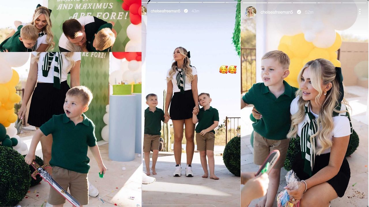 On Tuesday, Chelsea was dressed in a chic black pleated skirt, a white top and a stylish green-and-white striped neckerchief to celebrate the birthdays of Brandon and Maximus. The birthday party, seemingly themed around golf, was a lively affair featuring green, white and yellow decor, with a playful sign reading “ARE FORE!” hinting at their child’s fourth birthday.