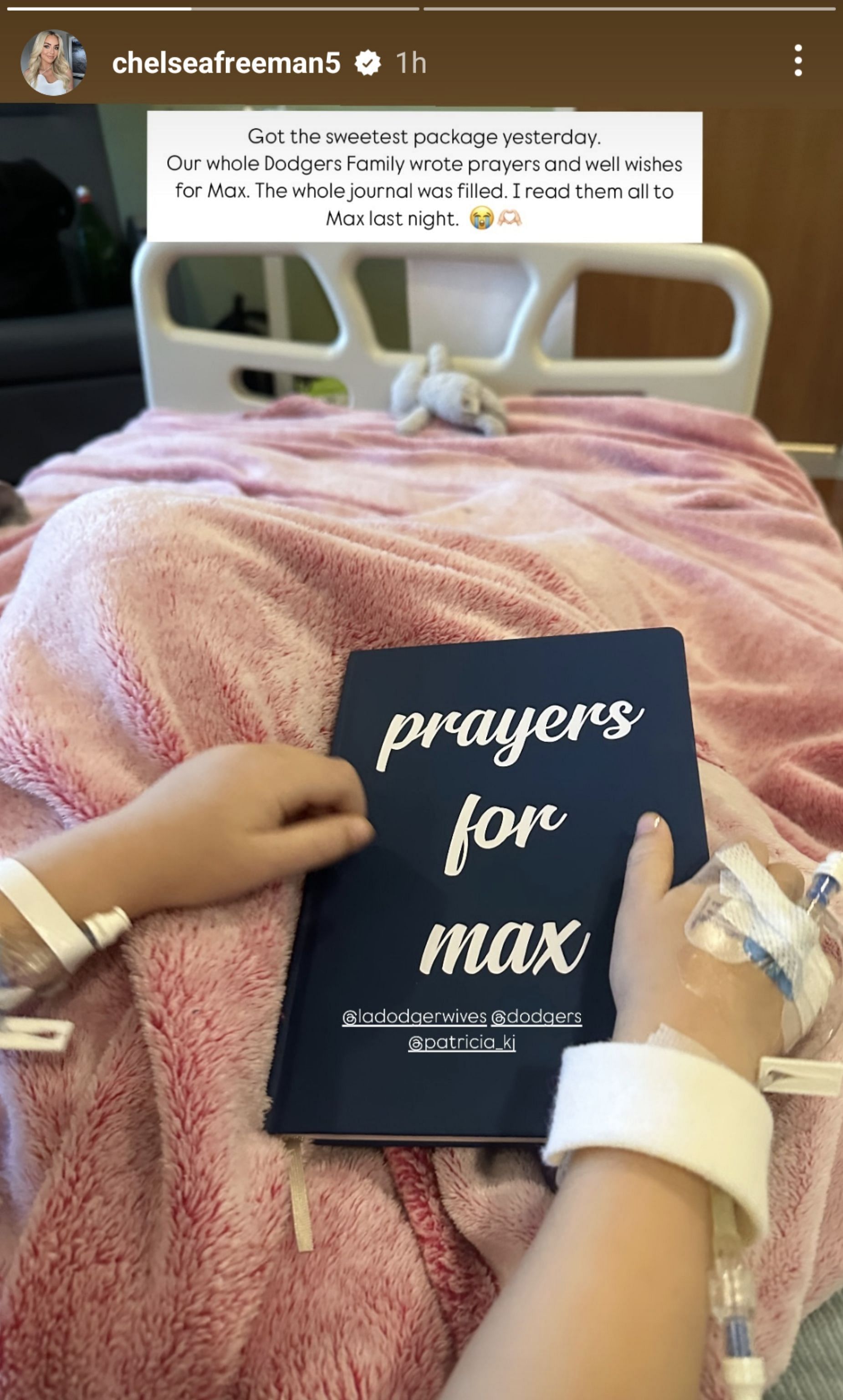"Got the sweetest package yesterday. Our whole Dodgers Family wrote prayers and well wishes for Max. The whole journal was filled. I read them all to Max last night," Chelsea wrote in her story.