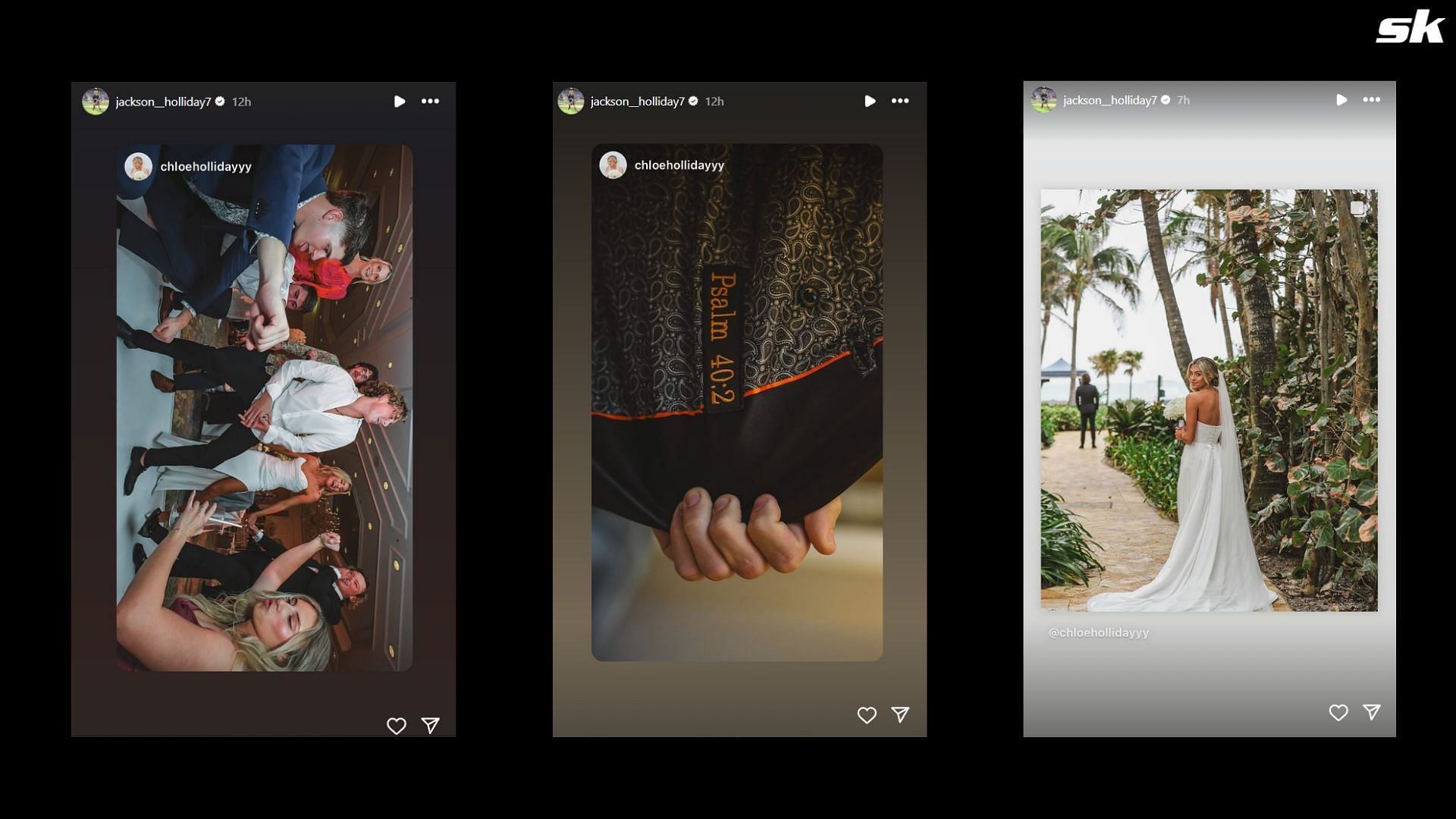 The pictures showcase a dashing Jackson Holliday getting prepped for his wedding, Chloe in her beautiful white wedding gown, the inside of Holliday's jacket with a testament from the Bible, the sneakers adorned by the happy couple, and Jackson dancing to the tunes of the DJ at his wedding reception along with his friends and family members.