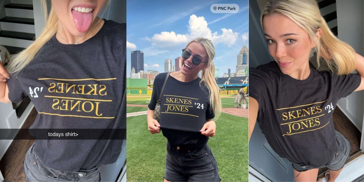 Dunne attended Saturday’s game with a custom-designed T-shirt, featuring her boyfriend and Jared Jones, one of the Pirates’ young pitching prospects. The “Pittsburg Pirates Paul Skenes and Jared Jones ‘24 Presidential Shirt” was produced by Baseball Dugout LLC, and it went viral after Dunne posted snaps of her on Snapchat.