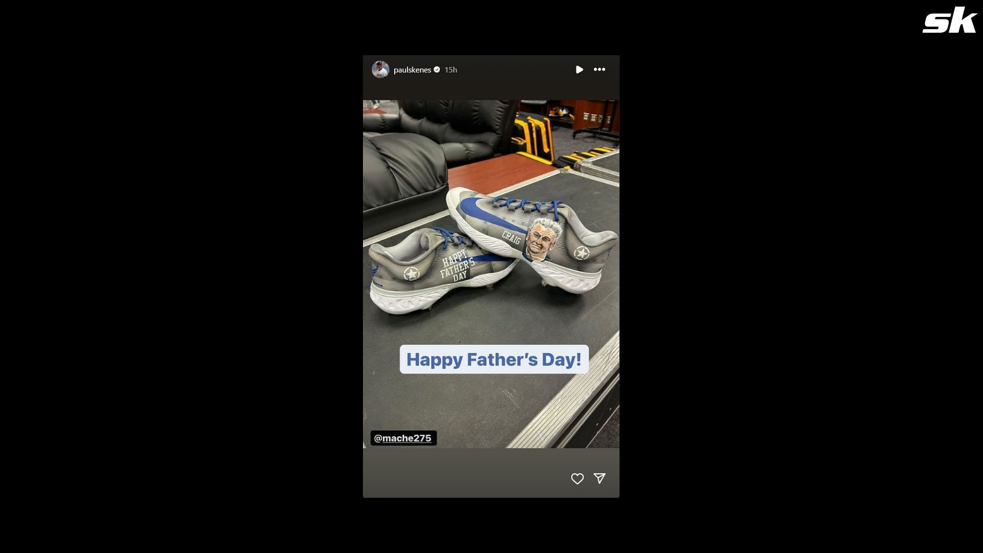 Skenes posted an image of his custom-designed Nike cleats for Father's Day, which were grey in color with a blue Nike streak. The cleats had Craig's face designed on them with the message 'Happy Father's Day'.