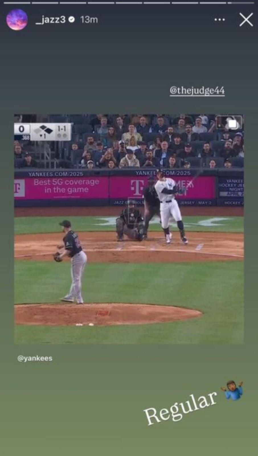 "Regular," Jazz captioned his Instagram story with Judge's home run clip.