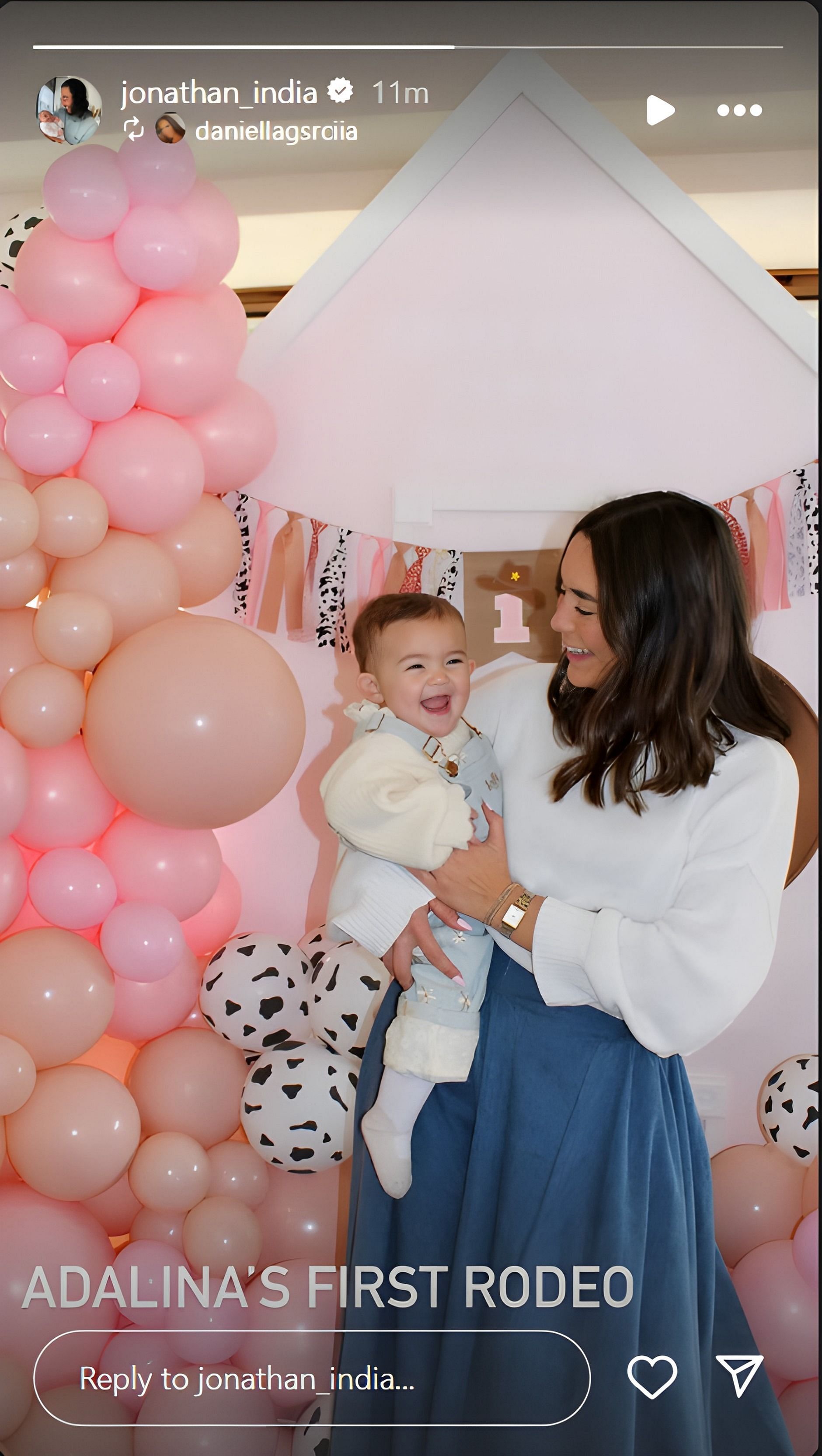 Daniella India initially posted the photos to her story on Jan. 24 and they were then shared by the infielder on Jan. 25. The first birthday party was rodeo-themed, and there were several videos of Jonathan partaking in rodeo activities.