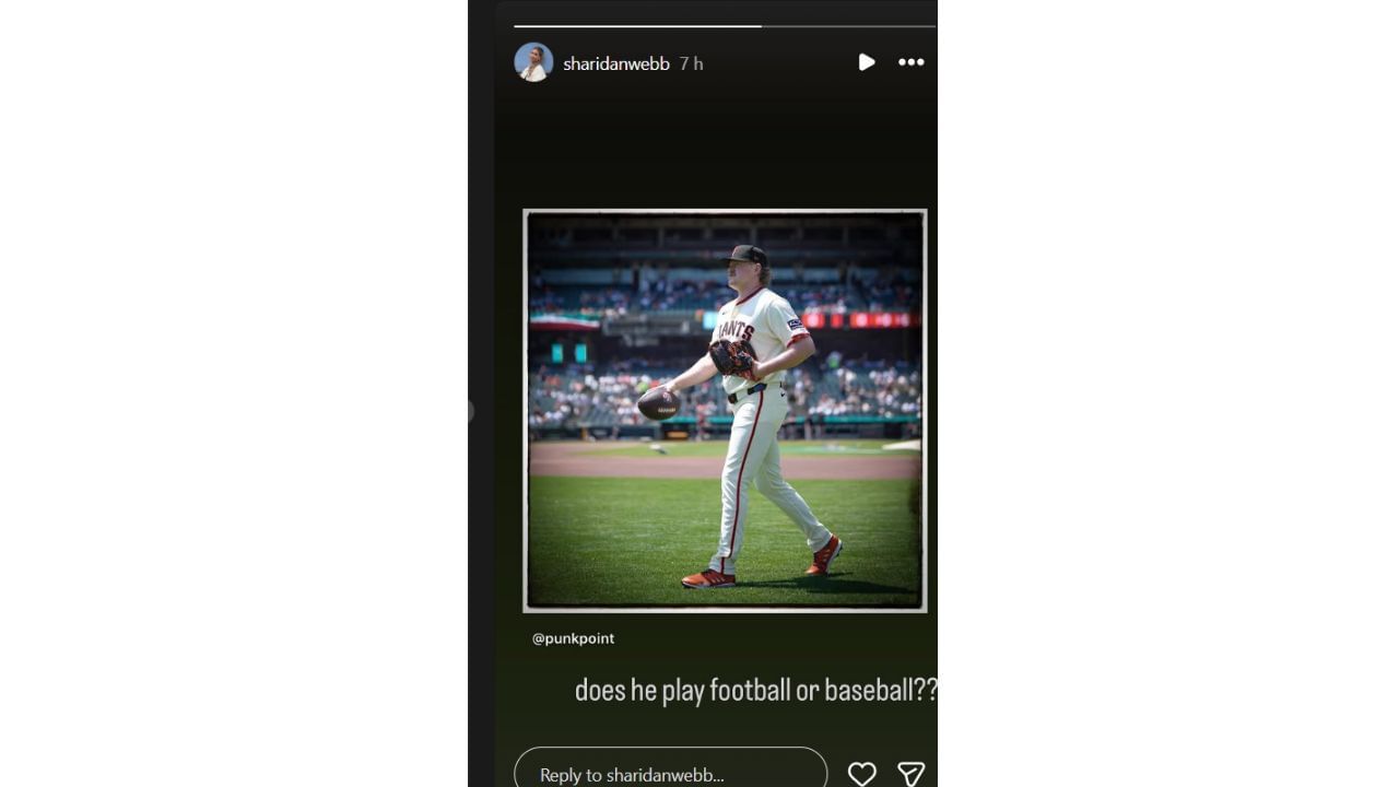 Logan Webb's wife Sharidan reacted to a picture where the San Francisco Giants ace is walking back to the dugout with a football in one hand and a glove on the other.