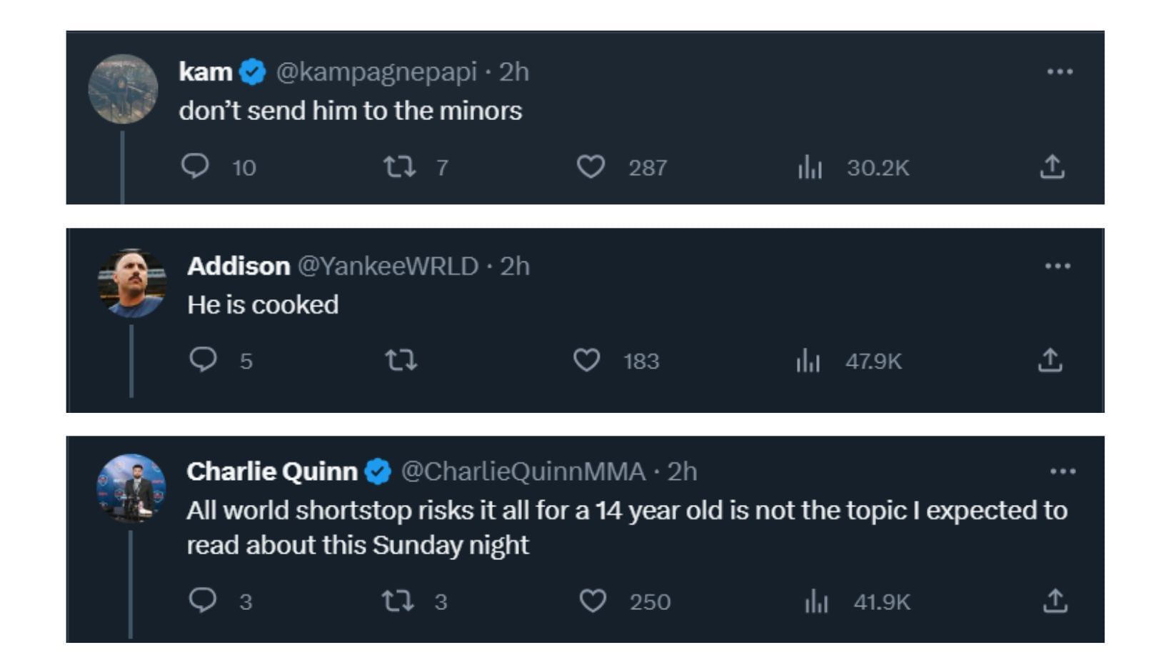 “During today’s game, we were made aware of the social media posts that are circulating regarding Wander Franco,” the Rays said in a statement. “We take the situation seriously and are in close contact with Major League Baseball as it conducts its due diligence.”