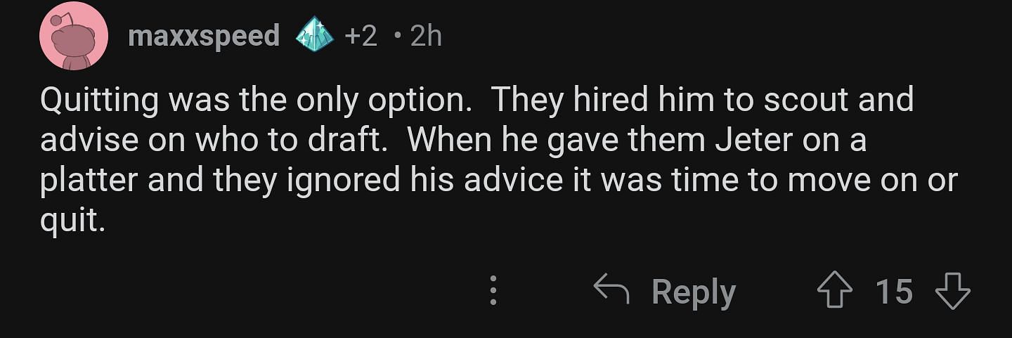 "Quitting was the only option. They hired him to scout and advise on who to draft. When he gave then Jeter on a silver platter and they ignored his advice it was time to move on or quit." one Redditor posted.